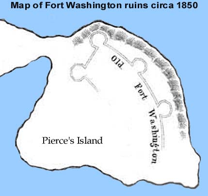 Located on Peirce's Island, Fort Washington was built in 1775 under orders of Major General John Sullivan, overall commander of the Portsmouth harbor defenses at that time, to control the Piscataqua River at "the Narrows" and to provide crossfire with Fort Sullivan directly across the river on Seavey's Island. A log boom defense was placed in the river between the two forts. The fort was garrisoned by 180 men under the command of Captain Titus Salter from 1775-78. The garrison was also responsible for the security of the powder magazine in Portsmouth. The fort was designed by Captain Ezekiel Worthen, who also designed Fort Sullivan and the Clark's Point (Shaw's Hill) Redoubt on New Castle Island, and who, with the rank of Major, later replaced General Sullivan as the overall commander of the Portsmouth harbor defenses. Peirce's Island was renamed "Isle of Washington" in 1776, in honor of General George Washington, who was then commander of the Army of New England in Cambridge, Massachusetts, during the siege of Boston. The fort was repaired and regarrisoned in 1814-15 during the War of 1812 when British warships blockaded the New England coast. The fort was in ruins by 1850, and was probably not used at all during the Civil War.