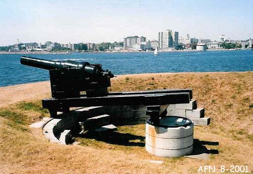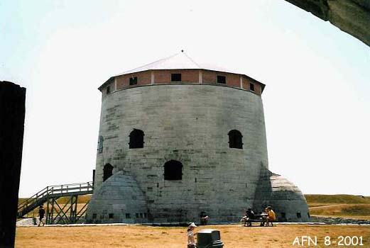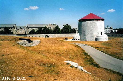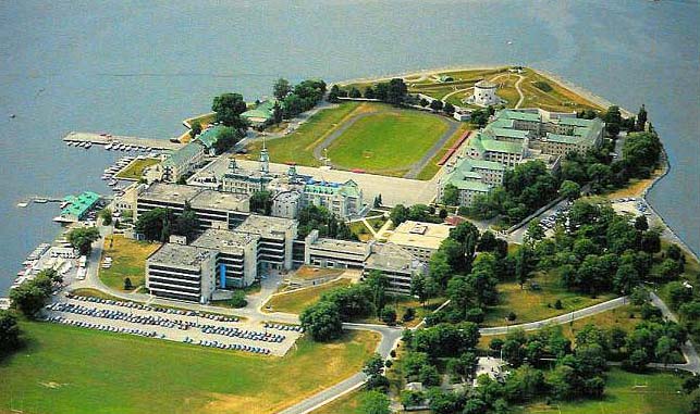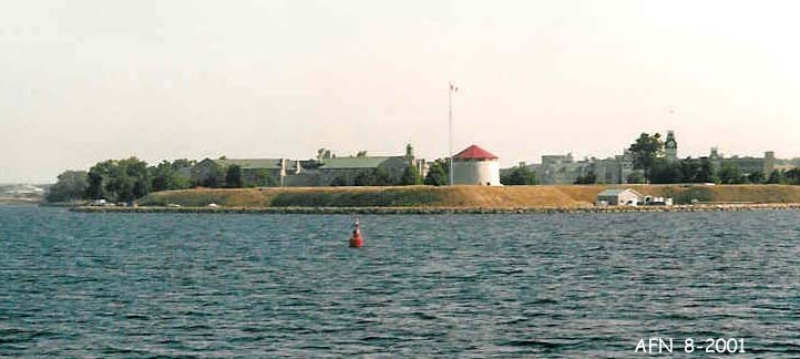 The Point and Fort Frederick, which derive their name from General Sir Frederick Haldimand, Governor of Canada from 1777 to 1786, are situated at the strategically important junction of Lake Ontario and the St. Lawrence River. About 1789, a naval depot was established on the Point and in 1790 - 91 a guardhouse to provide local defence was constructed. Later, a battery was installed which probably participated in the engagement with the U.S. Brig ONEIDA, on 10 November 1812. During the War of 1812 the demands of creating and maintaining the Lake Ontario Fleet, which by the conclusion of hostilities in 1815, included the 112-gun H.M.S. ST. LAWRENCE, required the construction of a blockhouse and extensive dockyard facilities. This naval presence continued, albeit at a diminished level, until the 1850's. Kingston's Martello towers, the largest of which is in Fort Frederick, were built 1846 - 1851 when a threat of war with the United States developed during the Oregon Crisis. The Point has been occupied by the Royal Military College since 1876. Naval facilities still standing on the College grounds include the Naval Hospital, Guardhouse, and the "Stone Frigate" (1820). Few sites have played so long or so important a role in the defence of Canada.