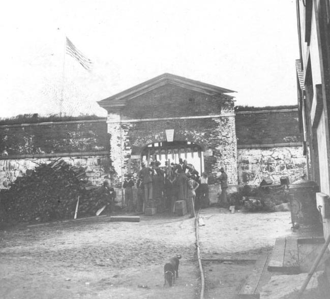 A large group of soldiers seemingly trying to prop up the wooden portcullis of the fort.