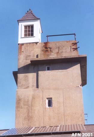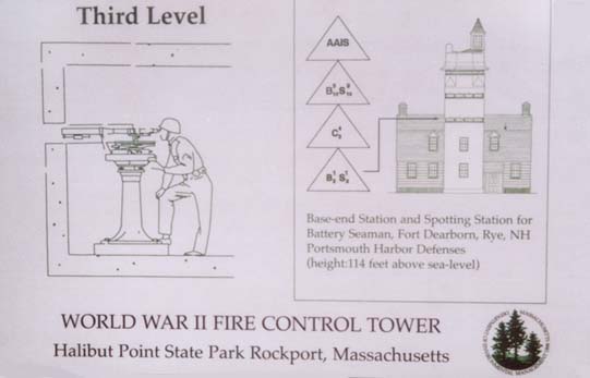 This five-story concrete tower with attached barracks was built on a leased 2.2 acre site under the authority of the Boston Harbor Defense Command, and was jointly used as a combined Base-End Station for Fort Dearborn in Rye, NH, and for Fort Ruckman in Nahant, Mass. The roof deck was used for Boston's anti-aircraft intelligence service (AAIS OP 18-Boston). The fifth-story level (with DPF) was used for Fort Ruckman (B9 S9 for Battery 104/Murphy). The fourth-story level (with DPF) was used for the Boston Harbor Defense Command - Gun Group Two (C2 OP 4), and the third-story level was used for Fort Dearborn (B1 S1 for Battery 103/Seaman). Boston's searchlight positions #29 and #30 were located north and east of the tower along the shoreline.