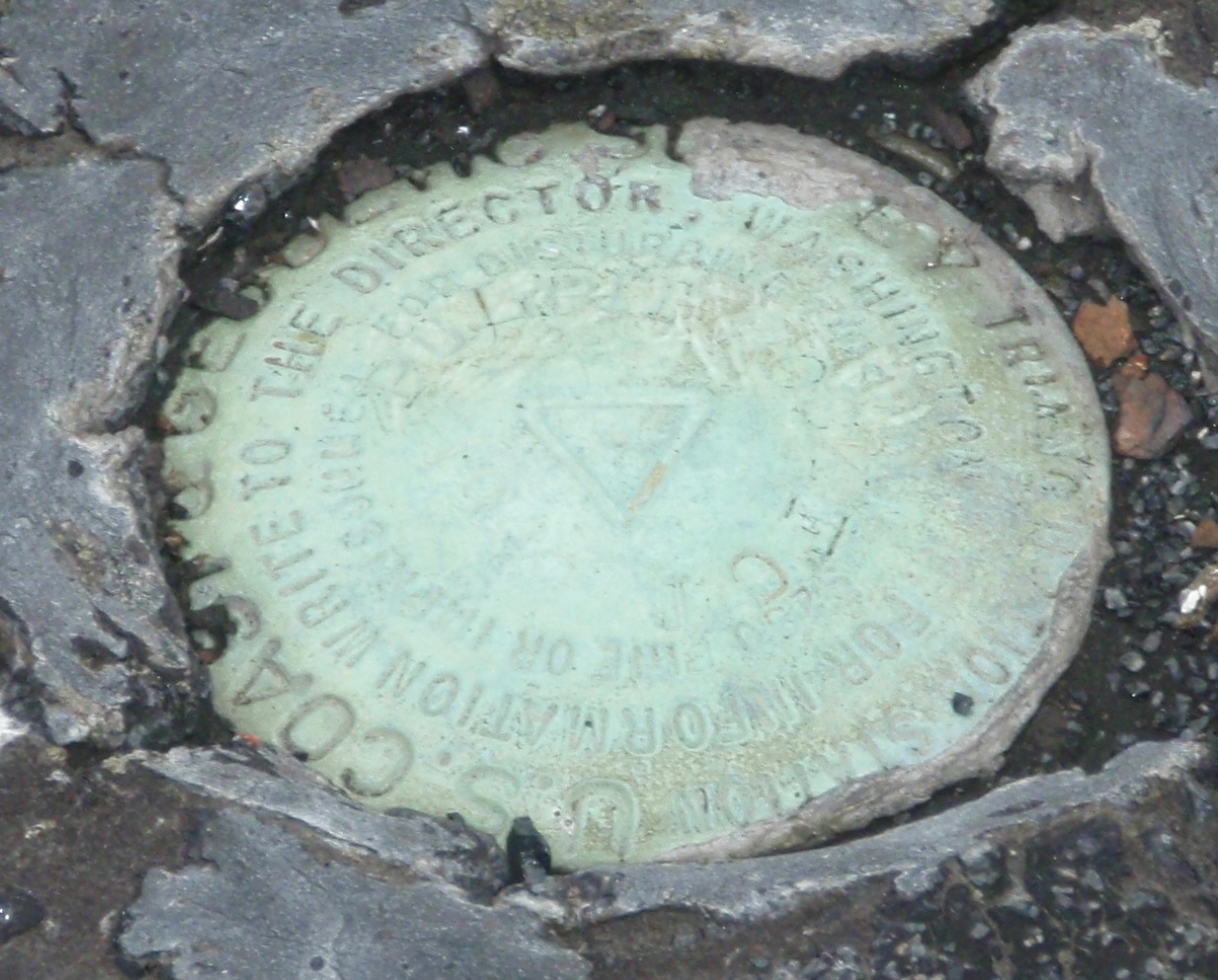 The original USCGS disk on the roof, before the roof was water-sealed.