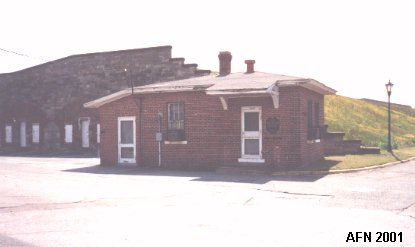 ![]() The Harbor Entrance Control Post (HECP), built 1943. The East Gate to the fortress is in the background. Built of reinforced concrete and contained a signal station and later a SCR-582 radar station. N 37°00.183 W076°18.310 |