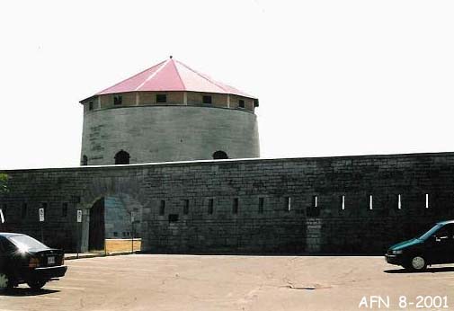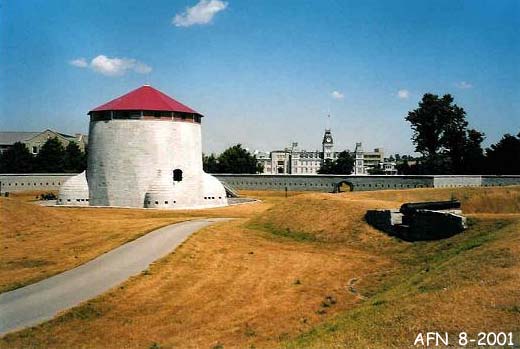 The Point and Fort Frederick, which derive their name from General Sir Frederick Haldimand, Governor of Canada from 1777 to 1786, are situated at the strategically important junction of Lake Ontario and the St. Lawrence River. About 1789, a naval depot was established on the Point and in 1790 - 91 a guardhouse to provide local defence was constructed. Later, a battery was installed which probably participated in the engagement with the U.S. Brig ONEIDA, on 10 November 1812. During the War of 1812 the demands of creating and maintaining the Lake Ontario Fleet, which by the conclusion of hostilities in 1815, included the 112-gun H.M.S. ST. LAWRENCE, required the construction of a blockhouse and extensive dockyard facilities. This naval presence continued, albeit at a diminished level, until the 1850's. Kingston's Martello towers, the largest of which is in Fort Frederick, were built 1846 - 1851 when a threat of war with the United States developed during the Oregon Crisis. The Point has been occupied by the Royal Military College since 1876. Naval facilities still standing on the College grounds include the Naval Hospital, Guardhouse, and the "Stone Frigate" (1820). Few sites have played so long or so important a role in the defence of Canada.