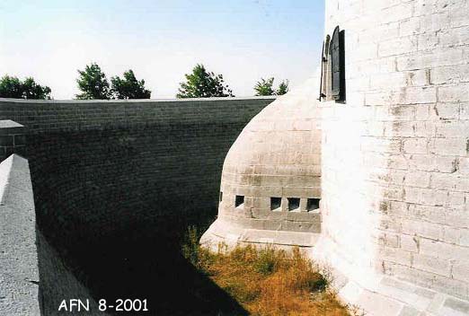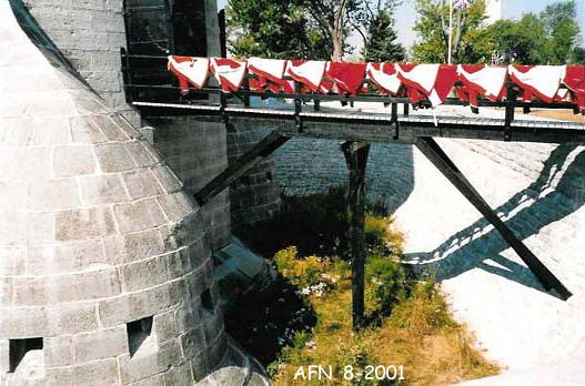 Located at the confluence of the Cataraqui and St. Lawrence Rivers, the French first had a military presence here in 1673, with a log stockade named Fort Cataraqui. It was rebuilt and renamed Fort Frontenac in 1675. It became a major depot of military supplies for western posts such as Fort Niagara and Fort Detroit and others. The British attacked and destroyed the fort after a long seige in 1758. Not affected by the American Revolution, Kingston was not regarrisoned by the British until 1783, who later established Tête de Pont Barracks in 1789 on the site of the old French fort. The present-day barracks were built in 1819 - 1824. The original French name was restored in 1939. It is now home to the Canadian Land Force Command and Staff College. Preserved ruins of the original fortress can be seen within the compound, and also outside the compound at Ontario Street and Place d'Armes.