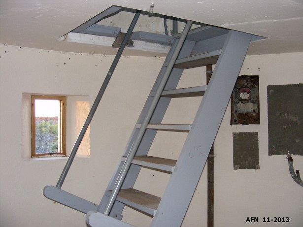 The ladder from the Plotting (or Radio) Room (6th floor) to the lower observation deck (7th floor). |