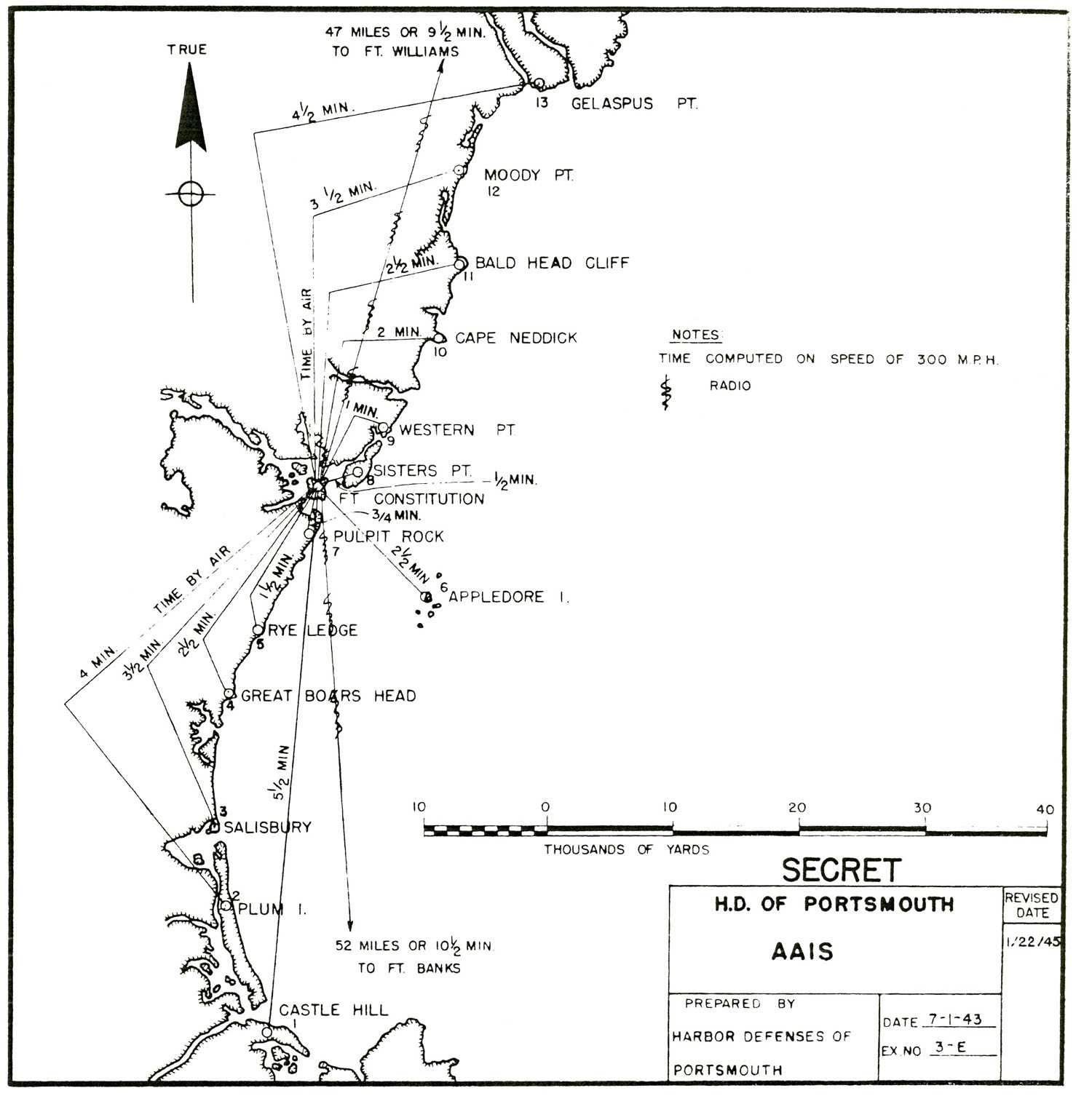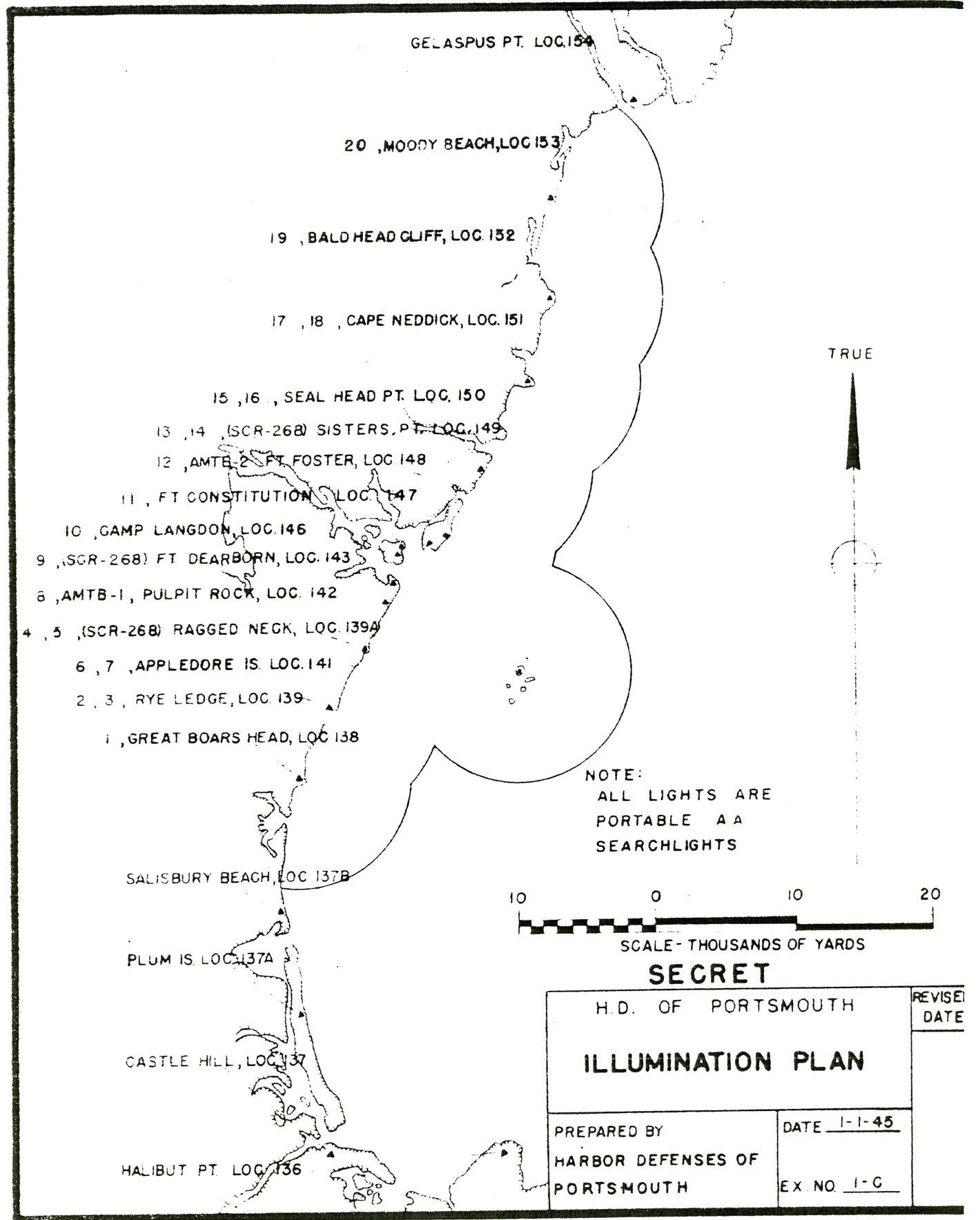 A note about station designations: B1 S1 (example) designates Base-End Station Number One, Spotting Station Number One (the full designation is correctly B1/1 S1/1, designating Base-End Station Number One and Spotting Station Number One for Tactical Gun Battery Number One); AAIS OP 1 (example) designates Anti-Aircraft Intelligence Service Observation Post Number One; HD OPS 1 (example) designates Harbor Defense Operations Station Number One. The tactical gun battery numbers assigned to Portsmouth in 1942 were as follows: