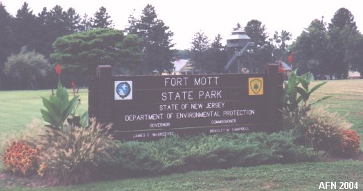A Confederate POW cemetery was created here in 1863. The POWs were held in Fort Delaware. Earthwork fortifications were also built here for ten (15-inch and 10-inch) Rodman guns on wooden carriages and platforms. Finns Point Battery was first located here in 1872. Only two gun emplacements and five magazines in the mortar battery were completed before construction was halted. Two 1872 magazines remain, and one was used again during the Endicott period. It has an early observation post on it. The current fort was created in 1897 beginning with a "6-gun battery" which eventually became Batteries Harker and Arnold. Along with Fort DuPont, it was built to compliment Fort Delaware. Fort Mott was named for Major General Gershom Mott of New Jersey. He served in the Mexican War and rose through the ranks during the Civil War. Mott resigned in 1866, and died in 1884. The Peace Magazine was built in 1904. Endicott batteries here are the combined Battery Arnold (1899 - 1943) and Battery Harker (1899 - 1941), Battery Gregg (1901 - 1910), Battery Krayenbuhl (1900 - 1918), and Battery Edwards (1902 - 1920). Battery Commander stations were later installed in the gun emplacements on Batteries Krayenbuhl and Gregg. Battery Edwards' casemates were constructed from two of the original 1872 magazines. Two steel observation towers are located here. The one by the river was built in 1902, and the one by the park office was built in 1903 (renovated 2002). The fort was on caretaker status beginning in 1922. Three of Battery Harker's guns were sold to Canada in 1941. Two of those are on display at Fort Cape Spear in Newfoundland. The other was sent to Fort Prével in Gaspé, Québec. The Army moved Fort Mott's officers' quarters via barge to Fort DuPont in Delaware. Parvin State Park (about 30 minutes east near Vineland) was a German POW camp during WW2.