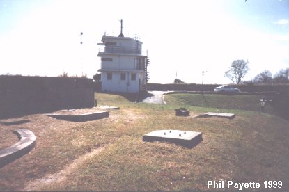 ![]() The Harbor Entrance Control Post (HECP), built 1943. The East Gate to the fortress is in the background. Built of reinforced concrete and contained a signal station and later a SCR-582 radar station. N 37°00.183 W076°18.310 |